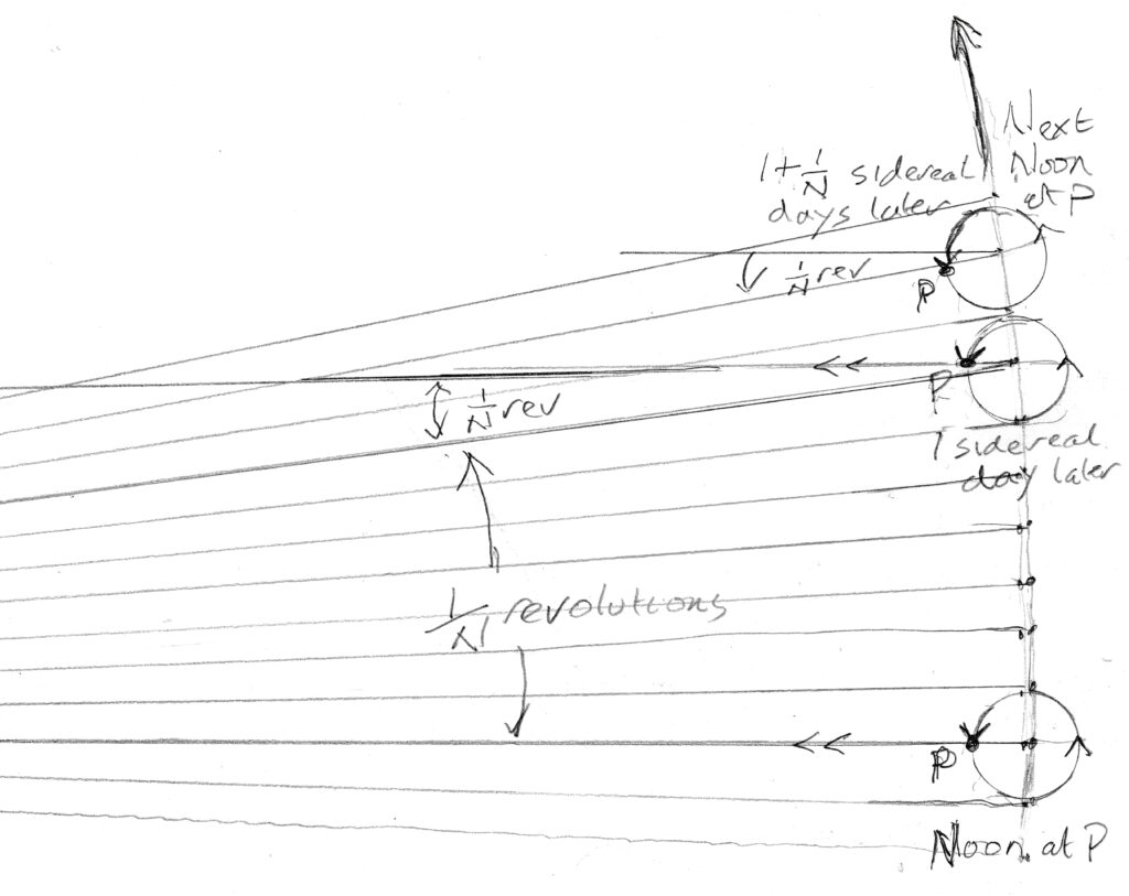 If we imagine an otherwise earthlike planet whose orbit is a perfect circle and whose spin axis is exactly perpendicular to the plane of its orbit, then we see that for a point on the equator to once again be directly facing the direction of the sun’s rays requires an additional 1/365 of a rotation making the solar day proportionately longer as shown in the picture below.