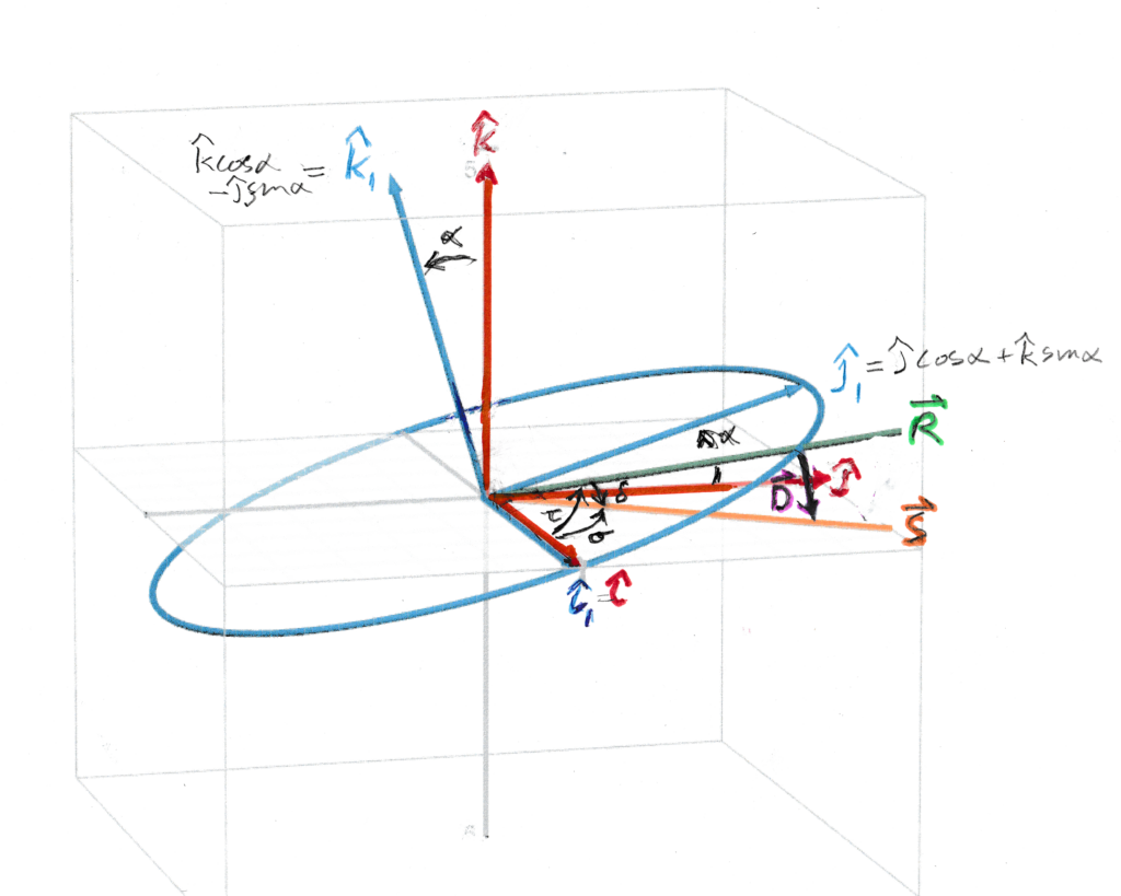 Let’s consider the Earth’s axis $#\hat{A}#$ to be tilted by an angle $#\alpha\approx 23^{\circ}\approx 0.4#$radians from the normal vector $#\hat{k}#$ of the orbital plane $#\hat{i}\hat{j}#$, to a new vector $#\hat{k_1}=\hat{A}#$ with $#\hat{i}=\hat{i_1}#$ being the axis of tilt and the tilt also taking $#\hat{j}#$ to $#\hat{j_1}#$, as shown below for the case of a time near noon about 40 mean solar days after having had a true solar noon exactly at the northern fall equinox. (Of course during each day the direction $#\hat{R}#$ of our point P from the centre of the Earth swings all the way around the axis $#\hat{A}#$ while $#\hat{S}#$ barely changes at all, and so the picture with $#\hat{R}#$ close to $#\hat{S}#$ only happens when the time is close to a solar noon – ie when the number d_1 of mean solar days is close to an integer.)