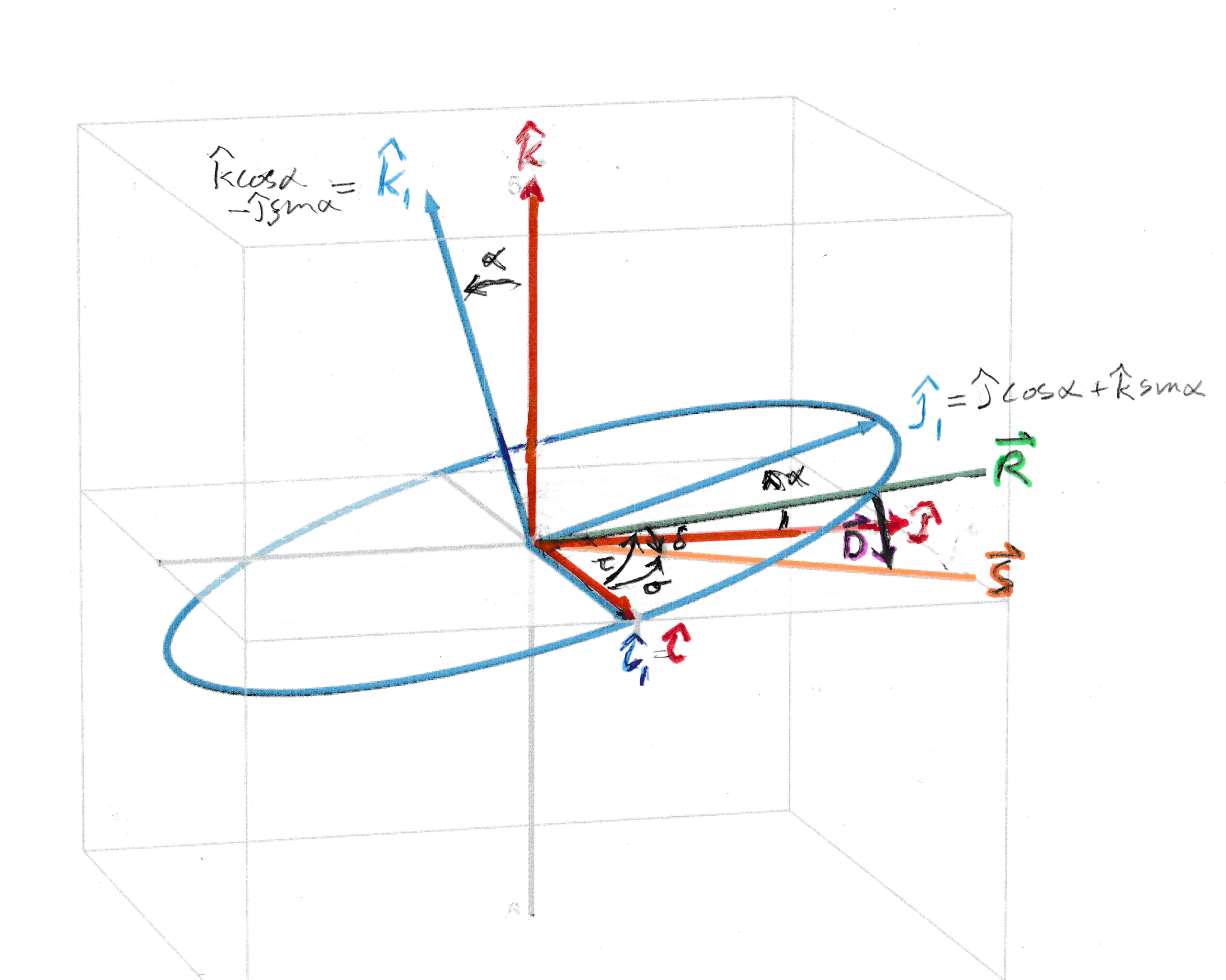 And if we look down the blue $#\hat{k_1}#$ axis the green $#\hat{R}#$ vector is slightly ahead of the orange $#\hat{S}#$ one.
