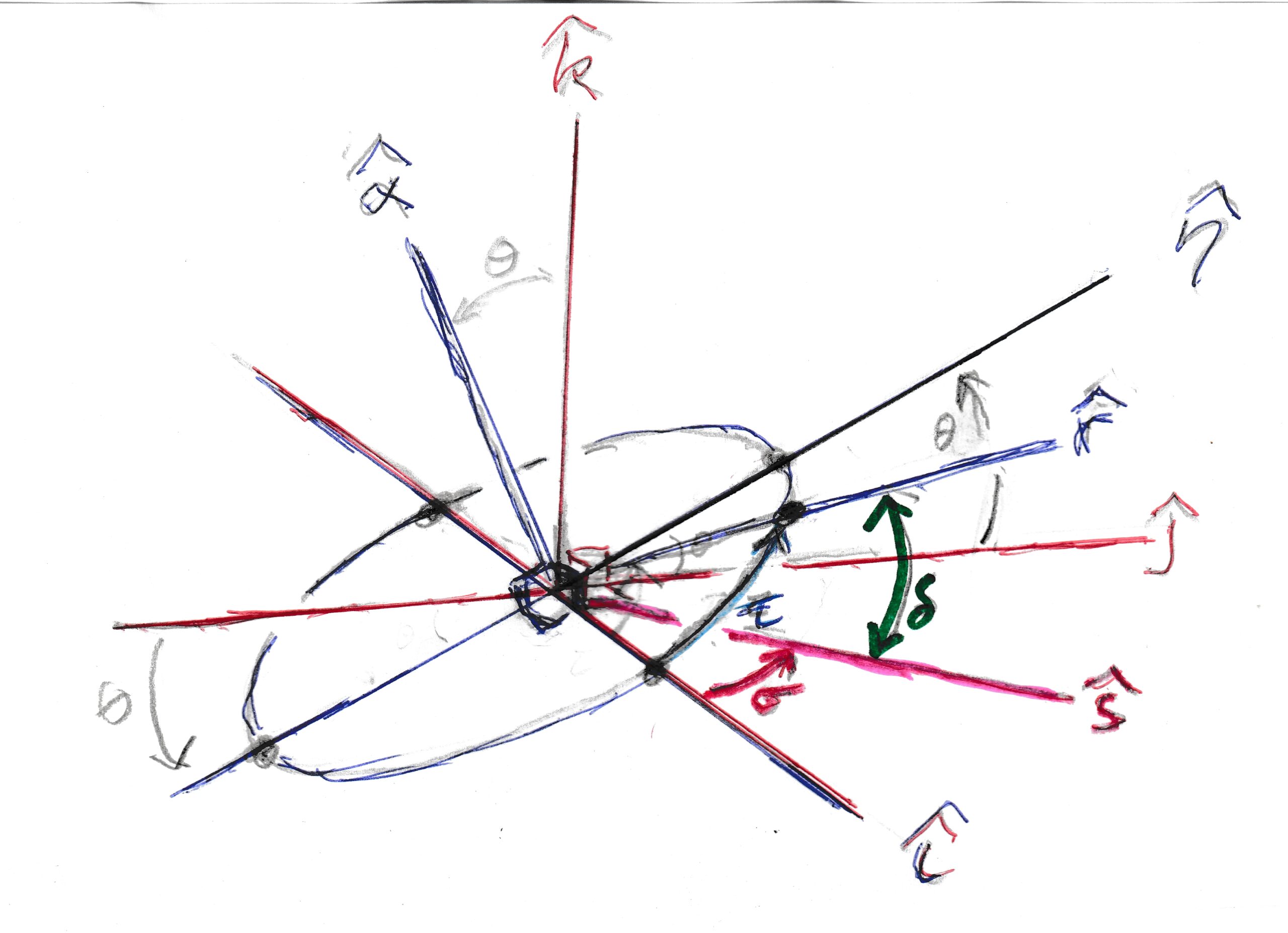Since $#\delta=\arccos{(\hat{r}\cdot\hat{s})}#$, we see that the min of $#\delta#$ is at the max of $#\hat{r}\cdot\hat{s}=(\cos{\tau}\hat{i}+\sin{\tau}(\cos{\theta}\hat{j}+\sin{\theta}\hat{k}))\cdot(\cos{\sigma}\hat{i}+\sin{\sigma}\hat{j})= \cos{\tau}\cos{\sigma}+\sin{\tau}(\cos{\theta}\sin{\sigma})#$.