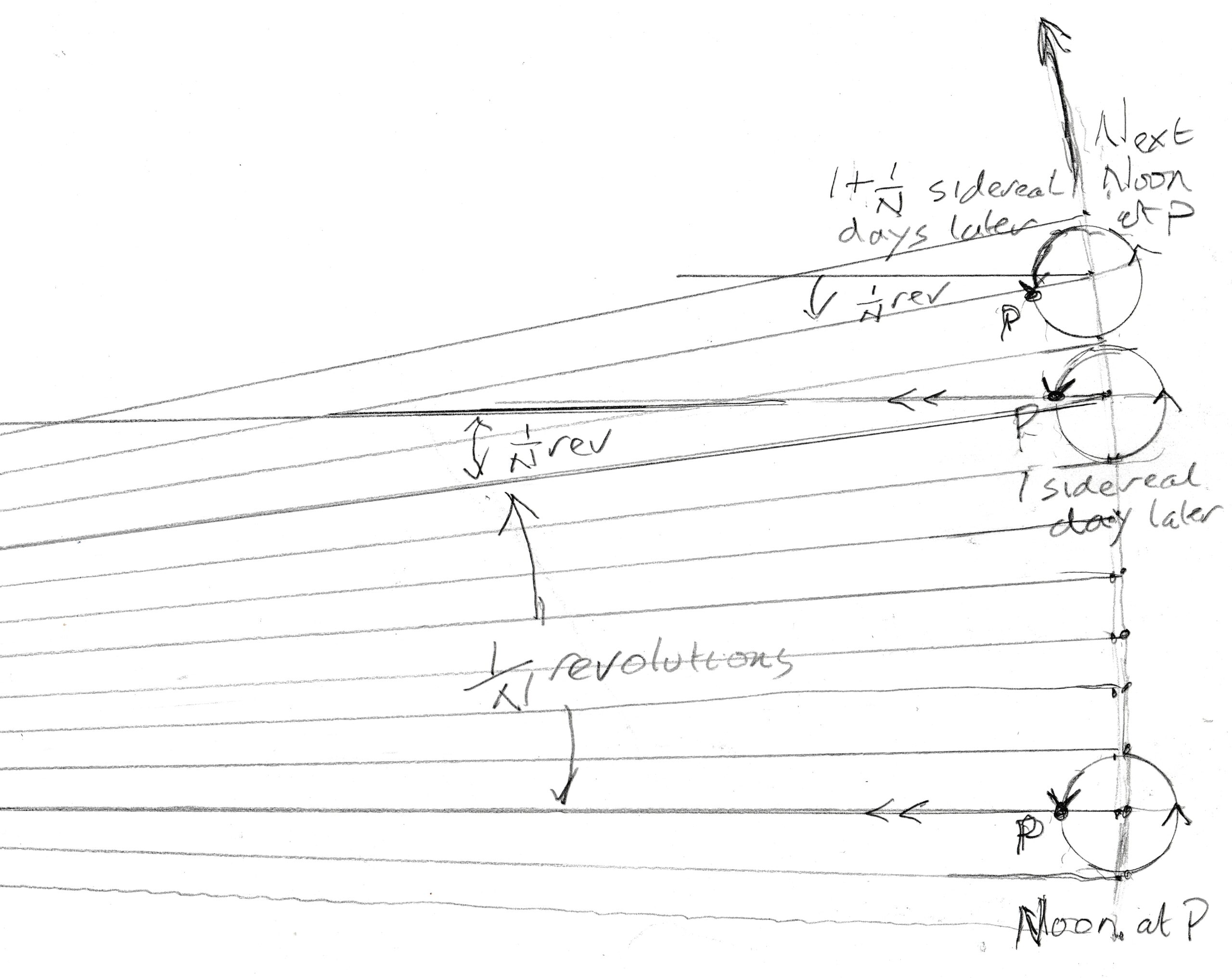 So when a point on earth is experiencing noon (ie closest to being directly under the sun), the line from Earth’s centre to the Sun must project directly onto the line from the centre of the earth through that point and after one sidereal day the view down the Earth’s axis looks just like the picture we had for the untilted case but [In this case the amount of extra rotation needed to bring a point back to noon after one full rotation of spin is not exactly constant and depends on the relationship between direction of tilt and direction from sun.] with the angular advance of the Sun around that axis being not exactly 1/365 of a full revolution but rather that multiplied by a projection factor which depends on how the radial direction of the point is related to the angle of tilt (being just reduced by a factor of the cosine of the tilt angle at the equinoxes which occur when the motion at noon is directly in the direction of tilt and being increased at the solstices where the direction of motion at noon is perpendicular to the direction of tilt so the projected travel distance is not foreshortened but the radius is)